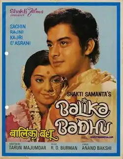 Balika Badhu (translation: Child Bride) is a 1976 Hindi romantic comedy-drama film produced by Shakti Samanta and directed by Tarun Majumdar.[1] The film is based on the Bengali novel of the same name by Bimal Kar, about a young girl who is married before she is old enough to understand what marriage is all about, against the backdrop of the Indian freedom struggle. Gradually she and her school-going husband grow as a couple and begin to love one another. The novel was previously made into a Bengali film, Balika Badhu (1967), which was also directed by Majumdar.[2]