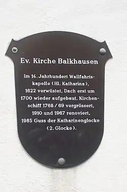 The church of Balkhausen is mentioned in the middle of the 14th century. It was always branch church of Jugenheim. In 1571, Balkhausen was granted the Amt Auerbach and 1621 administered by Amt Seeheim-Tannenberg.