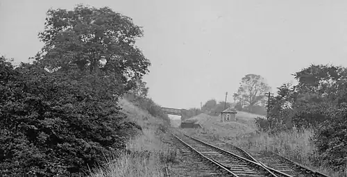 The platform and wooden station building with its ticket office, waiting room, canopy, etc. stood on the northern side of this single track line with two sidings on the southern side, a second added circa 1900, running to the east with a short loading dock and worked from the west with a brick built weighing machine house and a lineman's hut.[3] The main station building stood at the western end of the platform. An overbridge stood to the east with steps down leading to a path to the station buildings.