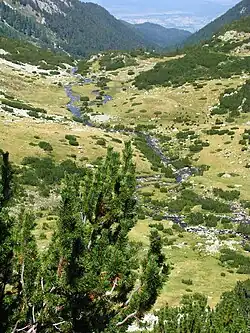 The river takes its source from the uppermost of the Banderishki Lakes, at an altitude of 2,310 m, situated in the Banderishki Cirque in northern Pirin. It initially flows to the northwest, catching the waters of the rest of lake group and the turns in northeastern direction. It flows at a high gradient of 100.77 m/km, which makes it turbulent, with many jumps and small waterfalls.[2] The highest waterfall is Banderishki Skok, reaching 11 m at an altitude of 1,700 m. Its surroundings were declared a protected area in 1965. The Banderitsa then reaches the homonymous mountain refuge and in the next two kilometers runs through rocky and narrow valley. Upon reaching the meadow Banderishka Polyana on the foothills of the summit of Kutelo (2,908 m), the river disappears underground and reemerges after 1.5 km. At 400 m southwest of the town of Bansko at an altitude of 1,063 m, the Banderitsa merges with the river Demyanitsa, forming the river Glazne.[2]
