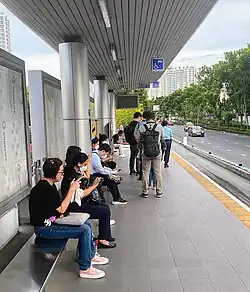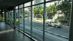Stations are located in the middle of the road and feature island platforms, accessible via skywalks/footbridges.[13] Consequently, buses have doors on the driver's side/right-hand side, unusual for buses in Thailand which have doors on the left-hand-side due to Thai traffic being left hand traffic. Stations have high-level platforms that provided step-free access to the Sunlong buses, which were high-floor buses. In addition, stations contain amentities such as ticket offices as well as step-free access for wheelchair users.