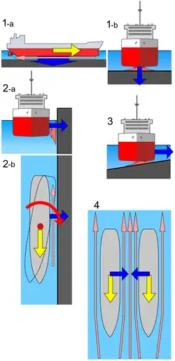 The asymmetric flow around a ship induced by the vicinity of banks causes pressure differences (Bernoulli's principle) between port and starboard sides. As a result, a lateral force will act on the ship, mostly directed towards the closest bank, as well as a yawing moment pushing her bow towards the centre of the waterway. The squat effect increases due to the decreased blockage.
