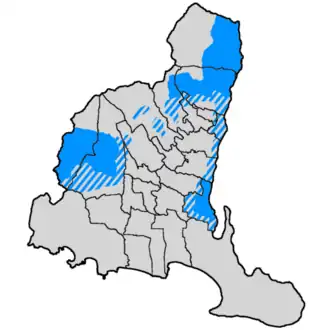 Madurese Banyuwangi is mainly used in border areas, its position is as the dominant language on the border.[2] Madurese speakers are the majority in several districts, such as Glenmore, Kalibaru, Kalipuro, Wongsorejo, and Muncar, which are Madurese enclaves, surrounded by Osing and Mataraman Javanese speakers.[1] Apart from that, there are also Madurese speakers in other districts in Banyuwangi, such as in Tamansari village in Licin district, especially in Ampelgading hamlet, due to its geographic isolation at the foot of the mountain, is also closer to the Madurese-speaking settlements in Bondowoso. Meanwhile, other villages in Licin are predominantly Osing-speaking.[2] Another district where there are Madurese-speaking people, but they are not the majority in Songgon district.[17] This is known because of the mamaca tradition, a typical Madurese tradition.[18] In the town of Banyuwangi, its use is more flexible and difficult to predict, the area is known as a gathering place for ethnic groups in the Indonesian archipelago to blend together. Madurese language, which is still widely used, also has quite an influence on the languages of other ethnic minorities, such as in Kampung Mandar (lit.'Mandarese Village'), where people of Mandarese descent from Sulawesi speak Mandarese and Malay, but slowly Madurese language began to influence and even replace Mandarese language.[19]