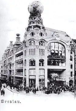 Built from 1902 to 1904 for the German Jewish merchant family Barasch by architect Georg Schneider, the store was opened on 4 October 1904. In 1929, the original Art Nouveau facade facing the market square was given a simpler, modernist look; the huge glazing above the main entrance was replaced with more conventional window rows. The large glass globe on the main tower at the corner of Ulica Szewska and Kurzy Targ (German: Hintermarkt), which had been damaged by lightning, was also removed.