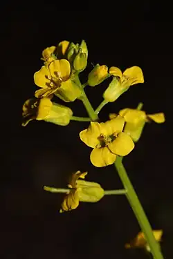 Barbarea orthoceras is a species of flowering plant in the family Brassicaceae known by the common name American yellowrocket.[2] It is native to North America, including much of Canada and the western United States, as well as parts of Asia. It grows in moist areas such as meadows and riverbanks. This is a perennial herb producing a stiff, branching stem to heights between 10 and 60 centimeters. The leaves are a few centimeters long and generally oval in shape with several rounded lobes toward the end. The inflorescence is a spike or cluster of bright yellow flowers at the tip of each stem branch. The fruit is a straight, narrow silique up to 5 centimeters long.