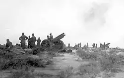 The 6th Australian Division had been formed in September 1939 as part of the Second Australian Imperial Force.[31] Prime Minister Robert Menzies ordered that all commands in the division were to go to reservists rather than to regular officers, who had been publicly critical of the defence policies of right wing politicians.[32] These policies favoured the Royal Australian Navy, which received the majority of defence spending in the interwar period.[33] The result was that when war came, the Army's equipment was of World War I vintage and its factories were only capable of producing small arms. Fortunately, these World War I-era small arms, the Lee–Enfield rifle and the Vickers machine gun, were solid and reliable weapons that would remain in service throughout the war; they were augmented by the more recent Bren light machine gun. Most other equipment was obsolescent and would have to be replaced but new factories were required to produce the latest items, such as 3-inch mortars, 25-pounder field guns and motor vehicles; War Cabinet approval for their construction was slow in coming.[34] The training of the 6th Australian Division in Palestine, while "vigorous and realistic", was therefore hampered by shortages of equipment. These shortages were gradually remedied by deliveries from British sources.[35] Similarly, No. 3 Squadron RAAF had to be sent to the Middle East without aircraft or equipment and supplied by the Royal Air Force, at the expense of its own squadrons.[36]