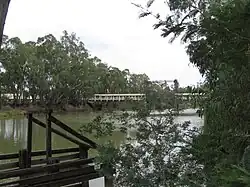 Barham's development was aided when a lift span bridge across the river opened in 1904, designed by Ernest de Burgh of the Department of Public Works and constructed by Monash & Anderson, with John Monash in charge. The bridge replaced a punt that was used to ferry people, stock and goods across the river, and allowed road access between the Riverina and the Victorian markets, while permitting the passage of paddle steamers when the middle section was raised. Until it was motorised in 1997 it was operated by a system of weights worked by two men turning wheels. The span is still occasionally raised. The bridge is now one of the oldest remaining across the Murray River.[6] A similar bridge was constructed upstream at the same time between Cobram, Victoria and Barooga, New South Wales.