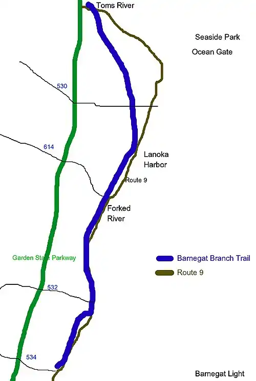 The trail occupies a 15.6-mile (25.1 km) abandoned rail corridor in Ocean County, New Jersey, that extends from Barnegat Township to Toms River.[1] The trail was built on the former Barnegat Branch Division roadbed of the Central Railroad of New Jersey (CNJ). The bankrupt CNJ was absorbed into Conrail in 1976, who terminated freight service the following year.[2]
