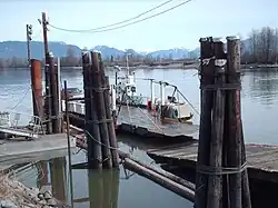 In response to petitions from residents,[1] the government ferry began operating in May 1916.[3] This cable ferry had previously been used at the Pitt River crossing. However, floating driftwood and the underwater cable snagging fishing nets made the vessel unsuitable for the new location.[4]