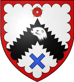 Argent, on a chevron indented sable between in chief a rose gules and in base a saltire couped azure, an otter's head erased of the first, a bordure engrailed of the third