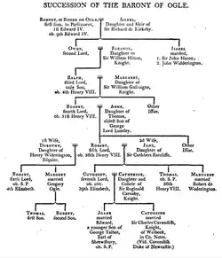 Baron Ogle is an abeyant title in the Peerage of England. It was created in 1461 for Robert Ogle. It fell into abeyance in 1691. The Ogles were a prominent Northumbrian family from before the time of the Norman Conquest. They settled at Ogle, Northumberland and in 1341 were granted a licence to fortify their manor house which became known as Ogle Castle. The family included seven Medieval Barons. Their estates fell by marriage to the Cavendish family (later Dukes of Newcastle) following the death of the 7th Baron in 1597.