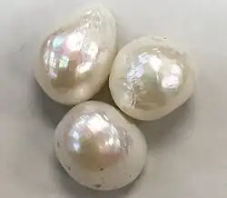 Baroque pearls are pearls with an irregular, non-spherical shape.[1][2] Shapes can range from minor aberrations to distinctly ovoid, curved, pinched, or lumpy shapes. Most cultured freshwater pearls are baroque because freshwater pearls are mantle-tissue nucleated instead of bead nucleated. Cultured saltwater pearls can also be baroque, but tend to be more teardrop-shaped due to the use of a spherical nucleation bead.