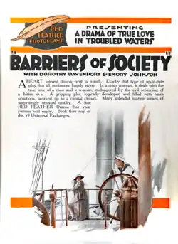 Barriers of Society is a 1916 American silent romantic drama film[1] directed by Lloyd B. Carleton. Universal based the film on the story written by Clarke Irvine and adapted for the screen by Fred Myton. Dorothy Davenport and Emory Johnson, lead an all-star cast of Universal contract players in this feature film.