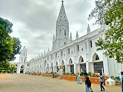The present structure of the shrine has a mixture of Gothic and French architectural styles. The facade above the portico has a row of statues of the Twelve Apostles, St. Francis Xavier and Fr. Constantine Joseph Beschi. The church has a relic of the True Cross, believed to be the one on which Christ was crucified.[1]