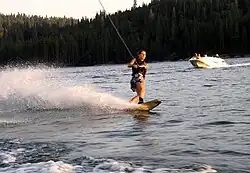 During summer months, the lake's surface temperature often reaches 80 °F (27 °C), making it well-suited for a range of water activities including fishing, swimming, water skiing, and boating. The surrounding area also offers a variety of trails frequented by hikers and mountain bikers.[53][54] Bass Lake also serves as a base for excursions into the Sierra Nevada and nearby Yosemite National Park.