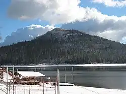 The lake is bound by Malum Ridge on the south and by Graham Mountain[6] which rises dramatically to an elevation of 6,090 feet (1,860 m) in the northeast. Goat Mountain,[7] which frames the lake on the west, is named after the goats that helped compact the soil of the original earthwork dam who grazed there.[8]
