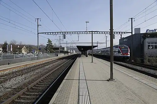 Bassersdorf is a railway station in the Swiss canton of Zurich and the municipality of Bassersdorf. The station is located on the Zurich to Winterthur main line, to the east of where the Zürich Airport and Kloten lines diverge. It lies within fare zone 121 of the Zürcher Verkehrsverbund (ZVV)[2] and is an intermediate stop on the Zurich S-Bahn services S7 and S24.[3][4][5]