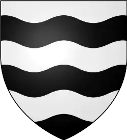 Amongst the earliest recorded arms of the Basset family were those of Gilbert Basset (d. 1241), "barry wavy of six, or and gules".[8] Variations of that design were followed by the older branches of the family. Following the marriage of Richard Basset to the rich heiress Matilda Ridel, his son Geoffrey (d. 1180x2) assumed the surname Ridel and adopted the Ridel arms "or three piles gules". His descendant, a Richard Basset, became the first Lord Basset of Weldon in 1299. Another Ralph Basset, a descendant of Geoffrey's brother Ralph became the first Lord Basset of Drayton in 1295, and bore the arms "or three piles gules with a quarter ermine". William Basset, another brother of Geoffrey Ridel, received no inheritance from his mother and so retained a variation of the old Basset arms. His descendant, yet another Ralph Basset, bore "argent, 3 bars wavy sable" on becoming the first Lord Basset of Sapcote in 1371.