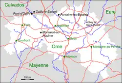 A charter of Henry I in 1113 confirmed a grant of income from "Fontanias in Obsimine" to St. Evroul Abbey by Ralph Basset. This is apparently the modern Fontaine-les-Bassets, 27 km northeast of Montreuil-au-Houlme. Also nearby is the small town of Ouilly-le-Basset, incorporated in 1947 in the modern town of Pont-d'Ouilly. The Domesday overlord of Ralph Basset and of Richard Basset was Robert D'Oyly. Reedy has suggested that Robert may have originated from Ouilly-le-Basset and may have been the overlord of the Bassets there as well as in England.[6] There are thus three towns associated with the Bassets within a relatively compact area of Normandy. Reedy also speculated that Ralph Basset may have come to the notice of the future king Henry I when Henry was lord of Domfront (from 1092 to 1100) during the reign of William II. Domfront is 30 km southwest of Montreuil-au-Houlme.