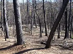 On 30 October 1955, another fire was reported in Bastrop State Park.[73] Officials confirmed that up to 900 acres (360 ha) of the forest were likely engulfed by fire.[74] An additional 200 acres (81 ha) were burned outside of the park's boundaries.[75] One park employee said that the fire was more "helpful than hurtful" because it ended up inadvertently burning a bushy area without damaging park structures, but other park officials disagreed on the extent of the damage.[73][76] The cabins and other buildings at the park were protected by encircling strips of newly plowed soil, which stopped the fire from spreading.[73] Several trees were damaged, but no private homes were caught by fire and no casualties were reported.[77] The fire was first reported on a Sunday morning before it spread through the park's northern part close to a heavily timbered area. Park manager G. M. Marbury said that he fought the fire with the aide of two more park employees the first evening, but others assisted the following Monday morning. Marbury said that they thought they had the fire under control before dawn, but the early morning winds continued to prolong the fire. Because of the sandy terrain, moving fire fighting equipment to the location was difficult. Marbury complained about the lack of volunteer support from Bastrop citizens. When asked about the cause of the fire, he said it was undetermined, but speculated that it may have originated from outside the park. He made a reference to the controlled fires that farmers in nearby areas start when clearing their lands.[73]