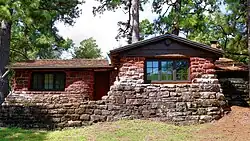 Companies 1805 and 1811 of the CCC built many of the park facilities between 1933 and 1939 using native stone to blend with the landscape.[4] The facilities were designed by architect Arthur Fehr and were considered a showcase of park architecture when built. Following the principles of the NPS, Fehr wanted the park's facilities to have harmony with its surrounding landscape of hills and forests, and used native materials for construction.[4][9] The stone cabins at Bastrop State Park are intentionally blended and appear to come out of the ground like a natural outcrop. This same non-intrusive design was used for the park's dams, bridges, culverts, and fences. These architectural features served as a role model for later park development by the CCC across the entire US.[4] By using the location's natural materials, the CCC was also able to keep construction costs down and reduced the need for importing materials from other areas.[10]