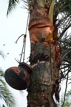 The first human outbreak of Nipah virus was in 1998 in Malaysia.[16] It was determined that flying foxes were also the reservoir of the virus, with domestic pigs as the intermediate host between bats and humans. Outbreaks have also occurred in Bangladesh, India, Singapore, and the Philippines. In Bangladesh, the primary mode of transmission of Nipah virus to humans is through the consumption of date palm sap. Pots set out to collect the sap are contaminated with flying fox urine and guano, and the bats also lick the sap streams flowing into the pots. It has been speculated that the virus may also be transmitted to humans by eating fruit partially consumed by flying foxes, or by coming into contact with their urine, though no definitive evidence supports this.[64]