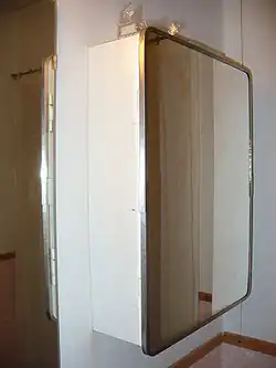 Mirror cabinets are cabinets located over sinks or above toilets and are so named because the cabinet door has a mirror on it. Mirror cabinets are usually used to store smaller items such as spare toothpaste or medicine. Many mirror cabinets are combined with a lamp that illuminates the mirror and thereby (especially in small bathrooms) also the room.