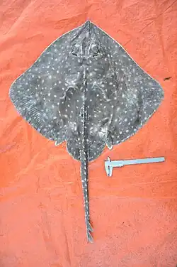 The white-dotted skate (Bathyraja albomaculata) is a species of skate in the family Arhynchobatidae. It is found in the south-western Atlantic off the coast of Uruguay, Argentina and the Falkland Islands and uncommonly off Chile (Guamblin Island) in the south-eastern Pacific Ocean, at depths ranging from 55 to 861 metres. Males reach maturity at the age of about 11 years and females about 10 years. At maturity the total length of males is about 62.8 cm and females 65.3 cm. The oldest reported specimen was 17 years old. The maximum length has been estimated to be almost one metre. It is oviparous. Egg capsules are oblong having horned corners, the horns at the back end appear first and are longer, and thinner than the front ones. Capsules are barrel-shaped, quite smooth, yellow-brown when freshly laid, but they get darker. Egg laying has been observed year-round, but most frequently in autumn and winter.[2]: 48  The animal eats mainly benthopelagic gammarids and polychaetes and also isopods. Juvenile white-dotted skates eat mostly gammarid amphipods, while adults eat mostly polychaetes.[2]: 337