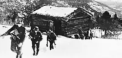 The German invasion of Norway began on 9 April 1940. It was the first instance of a modern combined operation of land, sea and air forces.[1] The Germans started by taking the major ports of Norway, but once they had accomplished those goals, they began to move through the interior of the country.[2] At the outset of the invasion, King Haakon moved to escape capture by the Germans. He and his wife, Crown Princess Martha, together with their children, including Crown Prince Olav made their way east toward Hamar in the Gudbrandsdal Valley.[3] When news of their escape reached the German high command. they ordered 100 highly trained German paratroopers to start chasing the royals and officials of the Norwegian government. As a result, the royal family had to stay constantly on the move through the Gudbandsdal Valley and the Swedish border.[2] While the King and his family eventually made it to neutral Sweden, a larger mechanized German force followed the paratroopers and began to make its way up the Gudbrandsdal Valley, moving north toward Otta.[3]