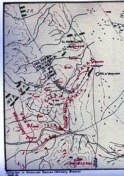The Abu Tellul sector was held by two regiments of the 1st Light Horse Brigade; the 2nd Light Horse Regiment held four posts; "Mussallabeh", "Maskera" "The Bluff" and "Vyse" while the 3rd Light Horse Regiment held the "Vale", "View", "Vaux", "Zoo" and "Zeiss" posts which surrounded the high plateau of Abu Tellul where the "Abu Tellul East" and "Abu Tellul West" posts were separated by a gully.[23] Before the attacks began, the commander of the 3rd Light Horse Regiment was asked if he thought the front line could stop a determined attack at Abu Tellul –