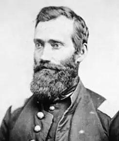 Meanwhile, realizing the vulnerability of the settlers of central Minnesota, the U.S. Volunteer Army preemptively dispatched mustering units from Fort Snelling to reinforce and protect the frontier. Among these was Captain Richard Strout's Company B, Tenth Minnesota Infantry Regiment. On this journey, Strout's company consisted of 55-65 men,[4][5][6] most of whom originally enlisted for the Civil War or were civilian volunteers seeking to protect their communities. Strout's command reported to Militia General John H. Stevens, the commander of state forces in the northern frontier, to patrol the areas around Hutchinson, Acton and Forest City. On September 2 they camped 2½ miles northwest[7] of the home of Robinson Jones, where the murder of Jones and several others by four young Dakota men on August 17, in what was later termed the Acton Incident, had shed the first blood of the conflict.