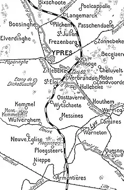 - ^ According to the findings of the Battles Nomenclature Committee of 9 July 1920, four simultaneous battles occurred in October and November 1914. The Battle of La Bassée (10 October – 2 November) from the Beuvry–Béthune road to a line from Estaires to Fournes, the Battle of Armentières (13 October – 2 November) from Estaires to the Douve river, the Battle of Messines (12 October – 2 November) from the Douve to the Ypres–Comines Canal and the Battles of Ypres (19 October – 22 November), comprising the Battle of Langemarck (21–24 October), the Battle of Gheluvelt (29–31 October) and the Battle of Nonne Bosschen (11 November), from the Ypres–Comines Canal to Houthulst Forest. J. E. Edmonds, the British Official Historian, wrote that the II Corps battle at La Bassée could be taken as separate but that the other battles from Armentières to Messines and Ypres, were better understood as a battle in two parts, an offensive by III Corps and the Cavalry Corps from 12–18 October, against which the Germans retired and the offensive by the German 6th and 4th armies 19 October – 2 November, which from 30 October mainly took place north of the Lys at Armentières, from when the battles of Armentières and Messines merged with the Battles of Ypres.[1]
