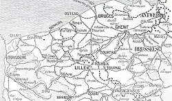 On 11 October, the British III Corps (Lieutenant-General William Pulteney), comprising the 4th and 6th divisions, arrived by rail at St Omer and Hazebrouck and then advanced behind the left flank of II Corps, towards Bailleul and Armentières.[12] II Corps was to advance around the north of Lille and III Corps was to reach a line from Armentières to Wytschaete, with the Cavalry Corps on the left as far north as Ypres. French troops were to relieve the II Corps at Béthune, to move north and link with the right of III Corps but this did not occur. On the northern flank of III Corps, in front of the Cavalry Corps was a line of hills from Mont des Cats to Mt Kemmel, about 400 ft (120 m) above sea level.[13]