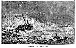 Herodotus gives a detailed description of the Persian fleet that assembled at Doriskos in spring 480 BC (see table).[29] However, after the fleet was struck the storm off the coast of Magnesia, approximately one third of the fleet was lost.[21] Thus, by Herodotus's reckoning, the Persian fleet would have had approximately 800 triremes at Artemisium.[22]
