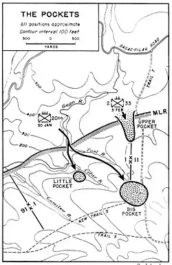 On 28 January, Hiroshi Nakanishi's 3rd Battalion, and Yorimasa Yoshioka's 20th Infantry staff, attacked I Corps' Orion-Bagac line and was able to break through into the 1st Division's rear along the Tuol River. The Japanese were separated into two pockets, a Little Pocket consisting of about one company, and a Big Pocket with 1000 men. By 5 February, Wainwright had committed five 1st Division companies, two 92nd Infantry battalions, one Scout battalion, one Constabulary battalion, plus tanks from the 192nd Tank Battalion, and artillery from the 24th Field Artillery, in an attempt to eliminate the Little and Big Pockets. On 6 February a Japanese salient formed, the Upper Pocket, when the 122nd Infantry and the 2nd Battalion, 33rd Infantry, penetrated within 800 yards of the Big Pocket. On 7 February, the 1st Division surrounded the Little Pocket, which was eliminated by 9 February. Concentrating on attacking the Big Pocket next, Trail 7 was secured by 10 February. On 11 February, Yoshioka attempted to breakout to the north, in conjunction with a general 14th Army withdrawal across Bataan. On 15 February, 377 Japanese reached their own lines, and the Upper Pocket was abandoned. With the elimination of the Japanese 20th Infantry, I Corps' line was restored on 26 February.[6]: 347–372