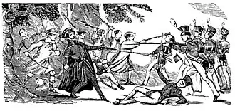 On 29 May, Oak Apple Day, Courtenay and a band of followers began to march around the nearby countryside with a flag and a loaf of bread on a pole (a traditional symbol of protest).[4] Courtenay rode a grey horse; his followers were on foot. Although at this stage the protesters were acting peacefully some wealthier landowners were becoming alarmed, and on 31 May 1838, a local magistrate, Dr Poore, issued a warrant for Tom's arrest.[5] It is not clear exactly what the warrant was for – to arrest Courtenay or to arrest workers who were in breach of contract with their employers.[6] A parish constable, John Mears, together with his brother, Nicholas Mears, and an assistant, Daniel Edwards, went to find Courtenay at Bossenden Farm, where he was staying with his followers. Courtenay shot and killed Nicholas Mears, the constable's brother.[7]