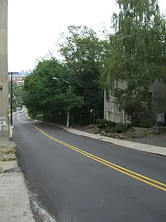 Bulls Ferry Road descends from the top of the Hudson Palisades down to the river.
