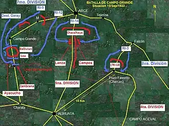 The Battle of Campo Grande was a major engagement during the Chaco War, in the southern region of the Chaco Boreal. During this battle, the Paraguayan Army successfully encircled two Bolivian regiments defending two of the three flanks of Fort Alihuatá, forcing them to surrender.