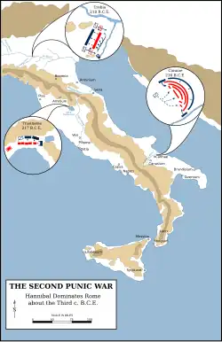 Shortly after the start of the Second Punic War, Hannibal crossed into Italy by traversing the Pyrenees and the Alps during the summer and early autumn of 218 BC.[6] He quickly won major victories over the Romans at Trebia and at Lake Trasimene.[7][8] After these losses, the Romans appointed Quintus Fabius Maximus Verrucosus as dictator to deal with the threat.[9][10]