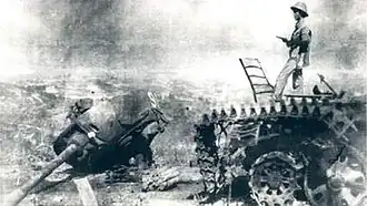 The situation was more endurable for the 42nd Army, as by 22 February they had taken Phục Hòa, Thất Khê, Quảng Uyên, and Đông Khê, penetrating some 25 km into Vietnamese territory from Shuikouguan.[14] However, it had failed to meet the 24-hour schedule to obtain the objectives around Cao Bằng, due to difficult terrain and frequent Vietnamese ambushes. The PLA 121st Division had to march for six days to arrive their destination at Khau Đồn, southwest of Cao Bằng.[15] Previously, on 20 February, a Chinese tank unit from the 42nd Army leading the advance into Bắc Sơn had been intercepted and lost a number of tanks to Vietnamese anti-tank missiles; the force had only survived after receiving reinforcements from its parental unit.[14]