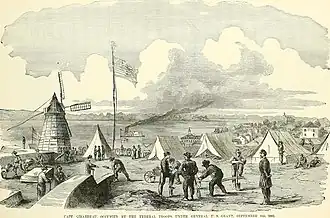 In 1861 General Ulysses S. Grant approved the construction of four forts at strategic locations around the city of Cape Girardeau. They were named Forts A, B, C, and D.[15] Fort A was positioned on a bluff overlooking the Mississippi River at the north edge of town and was meant to defend the city against Confederate gunboats on the river. Fort B was located on a hill now occupied by Southeast Missouri State University and was built to protect the city from enemy approaches on the Perryville Road and Jackson Road (now Broadway Avenue).[16] Fort C was near the present intersection of South Ellis Street and Good Hope Street and guarded approaches on the Bloomfield Road, Gordonville Road (now Independence Street), and Commerce Road (now Sprigg Street).[15]