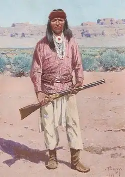 The soldiers stationed at Fort Apache included Troops D and E, 6th Cavalry; Company D, 12th Infantry; and Company A, Indian scouts. Captain Edmund Clarence Hentig was transferred to Fort Apache in 1876. He was the captain and commanded company D.[2] Second Lieutenant Thomas Cruse commanded Company A. Of his 25 scouts, 12 were from Chief Pedro's band and 13 were Cibecue Apache; Nock-ay-det-klinne was one of their own chiefs and medicine men. With the permission of the military, the scouts serving with the troops often attended Nock-ay-det-klinne's dances near Fort Apache.