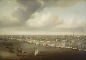 As the British ships entered the harbour of the Danish Navy, several of its ships took up station at the harbour's roadstead, forming a blockade. The Danish fleet defended the capital with these ships and bastions on both sides of the harbour inlet.[3] It was the second attempt by the British to try to prevent a Franco-Danish alliance, as the British had already entered Øresund with a fleet in August 1800, in order to persuade Denmark not to ally with France. The Danes agreed to the British terms upon hearing news of the assassination of Emperor Paul I of Russia, as his death meant the end of the Russian-led League of Armed Neutrality of which Denmark was a member.[3]