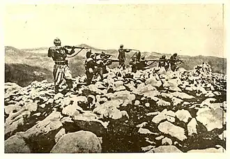The Battle of Deçiq (Albanian: Beteja e Deçiqit; Serbian: Bitka kod Dečića/ Битка код Дечића) was a battle between Albanian tribesmen and Ottoman forces during the Malësori uprising of 1911. It was a turning point for Albania's secession from the Ottoman Empire.[3] Dedë Gjo Luli, the organiser of the Albanian tribal forces, raised the Albanian flag for the first time since 1479 on the mountain of Deçiq after the Albanians had achieved victory over the Ottoman Turks.[4]