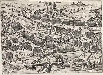 Battle of Dessau Bridge, etching by F. Hogenberg's workshop