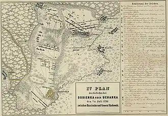 Around 15:00 on 18 July the Russians reached the river and attempted to cross it in small boats near the burned bridge, while another part of their forces crossed in the north. The initial Russian attack got bogged down in difficult terrain, and they took heavy casualties from the Polish artillery, while their own was less effective shelling the Polish fortified positions, however, there was enough of it to suppress the fire of those few guns. General Vasily Krasno-Milashevich, who commanded infantry of the left wing, sent 5 companies of grenadiers against sconces; the grenadiers, having made their way through swamp, took three sconces, and almost at the same time Phanagorians overcame the Polish left wing and captured all their fortifications at Uchanka. Thus the left wing and the center were shaken. A Russian cavalry unit (Elizabethgrad Horse Jaegers) made it to the right-wing Polish artillery emplacements but was pushed back with the help of the fresh cavalry of Stanisław Wielowiejski, and their commanding colonel Yevstafy Palmenbach was killed. After five hours of repeated assaults, the Russians retreated.[1][2]