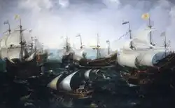 Van Heemskerk left some of his ships at the bay entrance to prevent the escape of any Spanish ships. Twenty from the Dutch fleet were ordered to focus on the Spanish galleons while the rest attacked the smaller vessels.[2] Van Heemskerk was killed during the first approach on the Spanish flagship as a cannonball severed his leg. The Dutch then doubled up on the galleons and a few of the galleons caught fire. One exploded due to a shot that penetrated its powder magazine. The Dutch captured the Spanish flagship but let it go adrift.