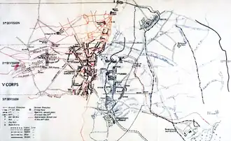 General Louis de Maud'huy found that instead of making another attempt to get round the German northern flank, his forces were menaced by a German offensive north of the Somme going in the opposite direction. From 25 to 27 September, the French XXI Corps and X Corps north of the Somme, with four Territorial divisions and the French II Cavalry Corps on the right flank, defended the approaches to Albert. On 28 September, the French were able to stop the German advance on a line from Maricourt to Fricourt and Thiepval south of the Ancre.[4] The Germans could see French troops in Beaumont-Hamel and Serre on the far side of the valley.[5] On 29 September, Joffre reorganised the command of the French forces north of the Somme into a new Tenth Army.[6] By 5 October, the German Guard Corps had reached Serre; by October, the front line on which the French and then British Armies faced the Germans around Serre had been formed, little to change until the big German retreat of Operation Alberich (9 February – 20 March 1917).[7]