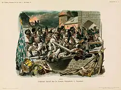 Wrede, following successful skirmishing against the French, began to deploy his forces to face the main French force of 20,000. On 30 October Wrede placed his centre with the River Kinzig behind it, and his right wing to its south in an isolated position with only a single bridge linking it with the main force. Napoleon had only 17,000 troops[11] including Marshal MacDonald’s infantry and General Sébastiani’s cavalry to face the enemy forces blocking them. Due to dense forests on the east of Wrede’s positions the French were able to advance and make close contact with the allies almost unseen.[11] Napoleon decided to attack the allies' left with all available troops. By midday Marshal Victor and MacDonald had cleared the forest in front of the allies' centre. Soon after, General Drouot found a track in the forest towards Wrede’s left on which cannon could be moved. Three hours later Grenadiers of the Old Guard had cleared the area of allied troops and Drouot began to deploy 50 cannons supported by cavalry of the Guard and Sébastiani.[11] A brief artillery bombardment from Drouot’s cannons silenced Wrede’s 28 cannons. French cavalry then attacked and pushed back Wrede’s cavalry on his left flank, then attacked the flank of Wrede’s centre. Wrede’s centre started to fall back, skirting the banks of the Kinzig River and suffering heavy casualties. On the right wing, Wrede’s forces tried to cross the single bridge over the Kinzig River to reinforce the centre, but many drowned in the attempt.[11] Wrede was successful in rallying his troops to form a defensive line running from Lamboy Bridge to the town of Hanau. During the night the allies abandoned Hanau. The French occupied Hanau on 31 October with little resistance. Napoleon made no effort to pursue Wrede, the main road to Frankfurt was now reopened, the French retreat continued.