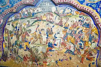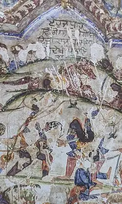 ![]() Defaced, abraded, and deteriorated mural depicting the Battle of Kartarpur (April 1635) from Gurdwara Chhevin Patshahi, Hadiara, Lahore district. In the middle can be seen Guru Hargobind slicing Painde Khan into two | |||||||